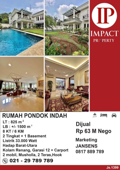 Hunian cocok di area berkembang Pondok Indah, Jakarta Selatan. rumah 2 lantai ini mempunyai fasilitas 8 kamar tidur dan 6 kamar mandi dengan total 1500 m2.